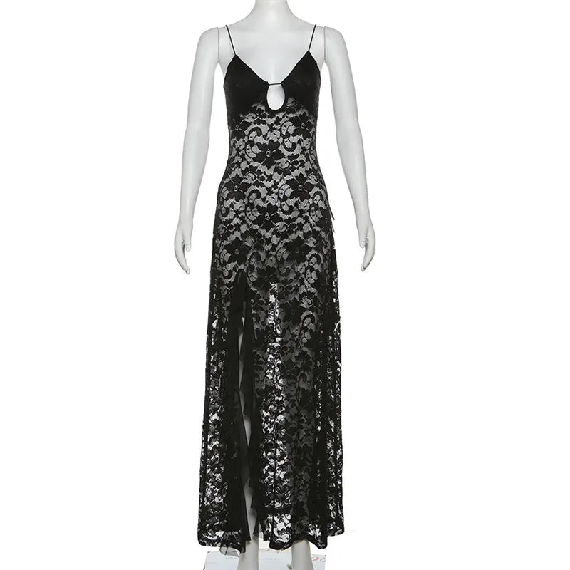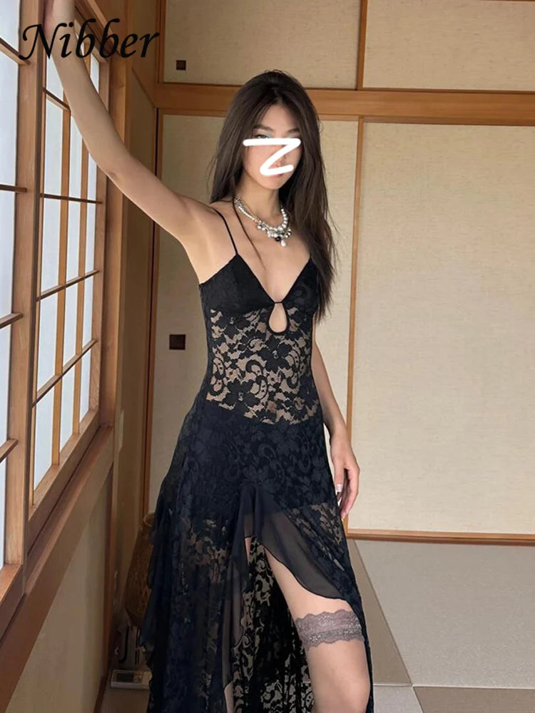 Nibber Sexy See Through Lace Sleeveless Long Dress Women Patchwork Summer Backless V-neck Side Slit Party Evening Maxi Vestidos