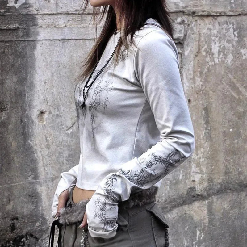 Women Casual T-Shirt Round Neck Long Sleeve Vintage Totem Print Pattern Bottoming Women's Tube Tops Tee Streetwear Y2k